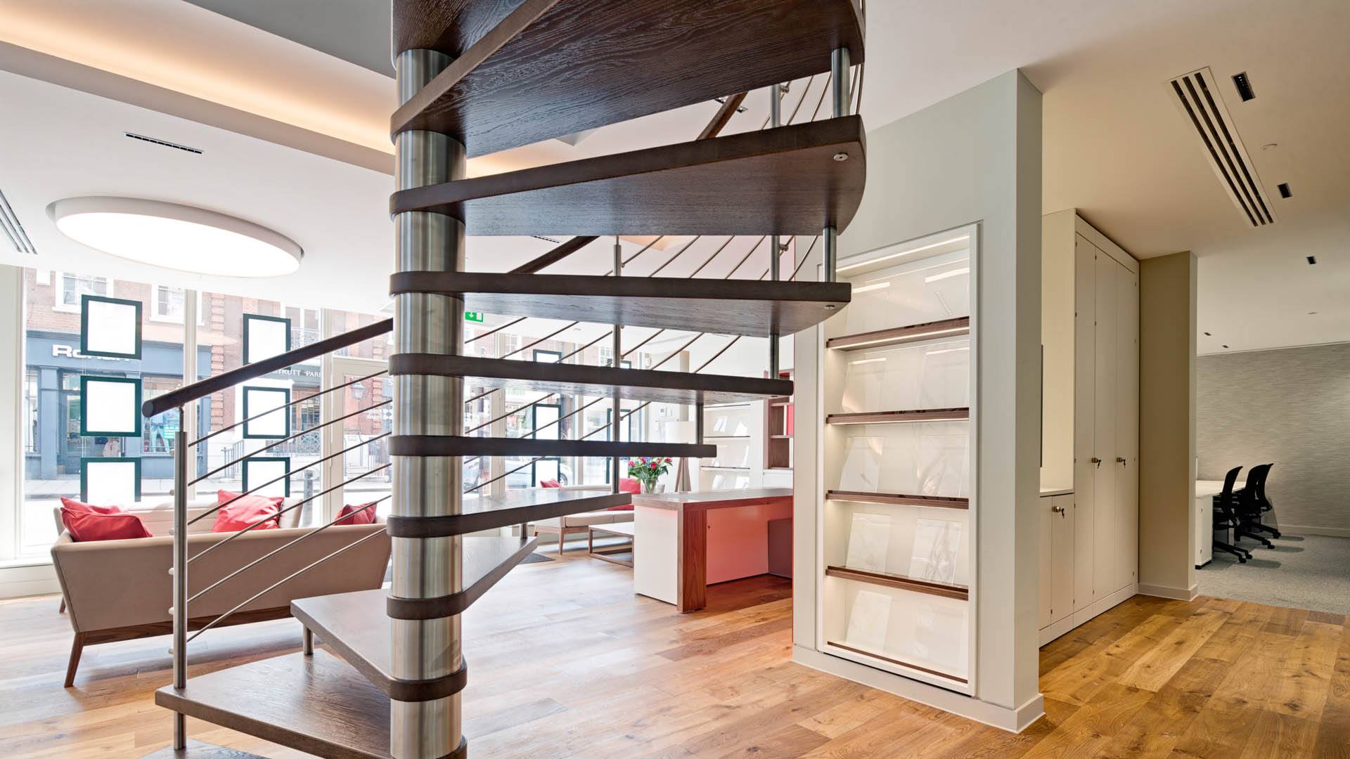 The two floors had been used by different companies before, so our first major challenge was to create one office space from two separate units. The second was to transform the building into a space that lived up to the prestigious Knight Frank brand. We also had to undertake some significant structural work, cutting a large concrete opening in the ground floor ceiling to create an opening for the wood-step spiral staircase that would link the two floors.