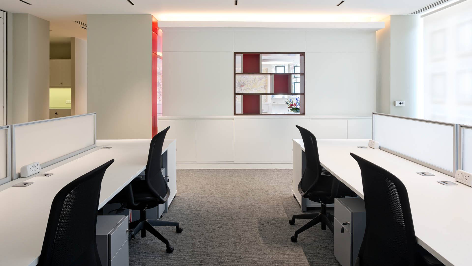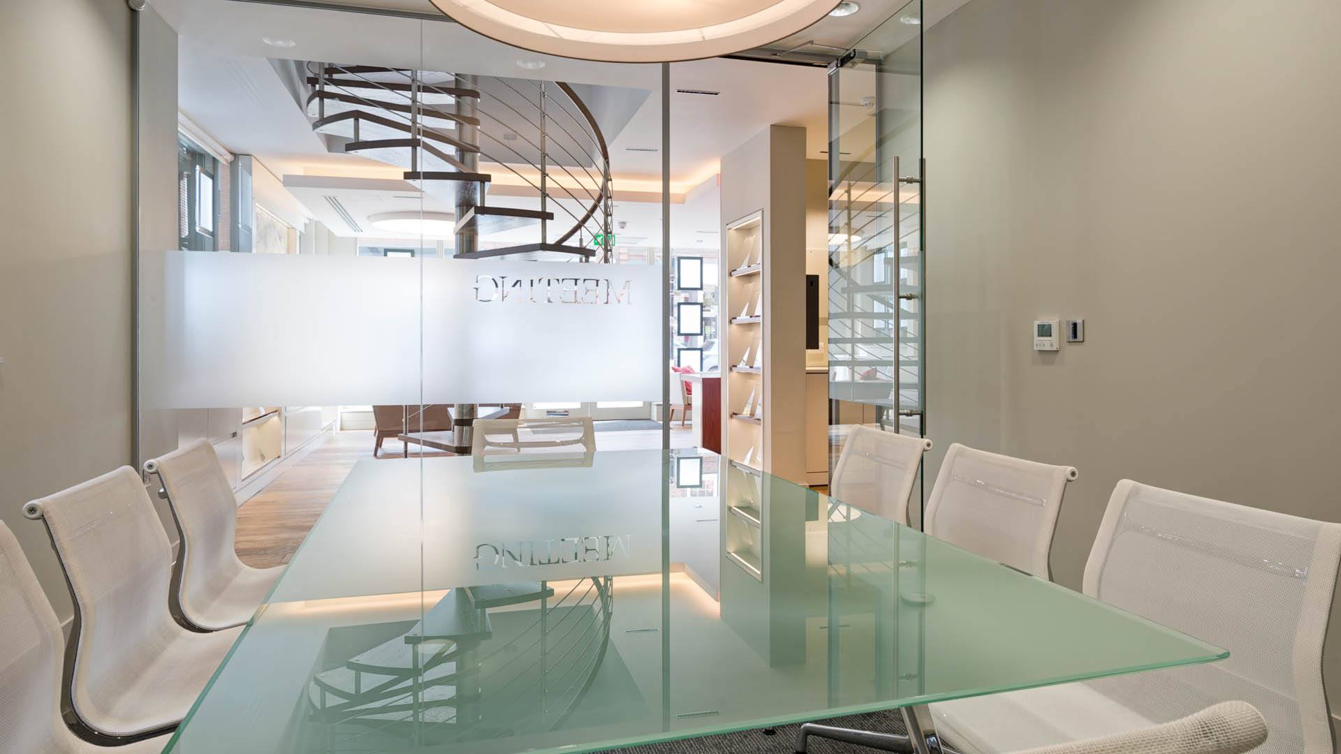The office refurbishment has created a new space which is bold, striking and thoroughly modern. The full height windows allow daylight to bathe the natural wood flooring and the inviting white sofas in the meet and greet area. The meeting rooms sit behind contemporary glass partitioning, continuing the sense of space and light, while the back-office work area provides all the functions the team requires in a clean and compact footprint.