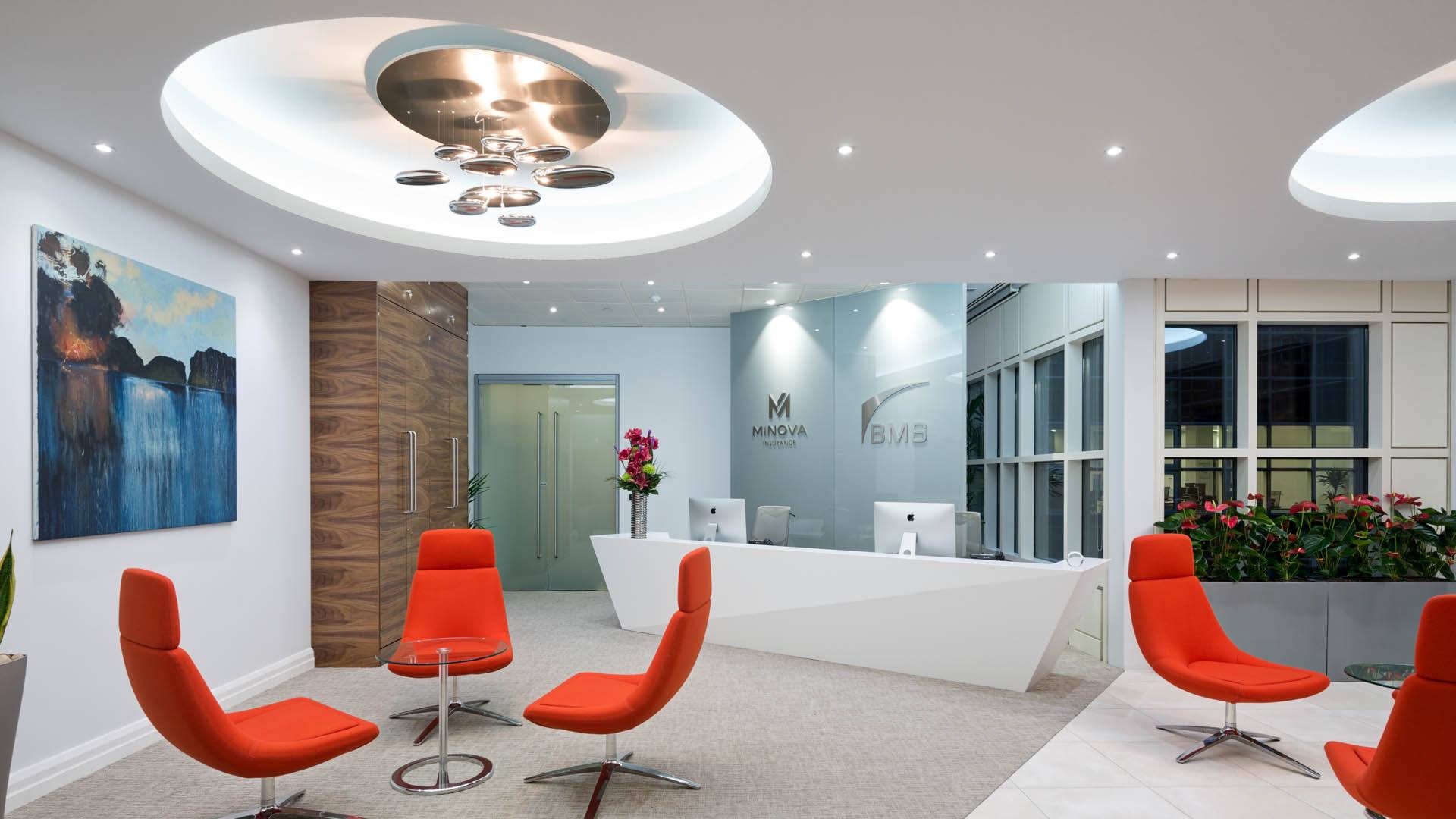 To move the company’s executive suite and several operational departments from the fifth to the fourth floor of the building, design and build a more welcoming reception area and fit-out the consolidated and rationalised 10,900 ft2 office space