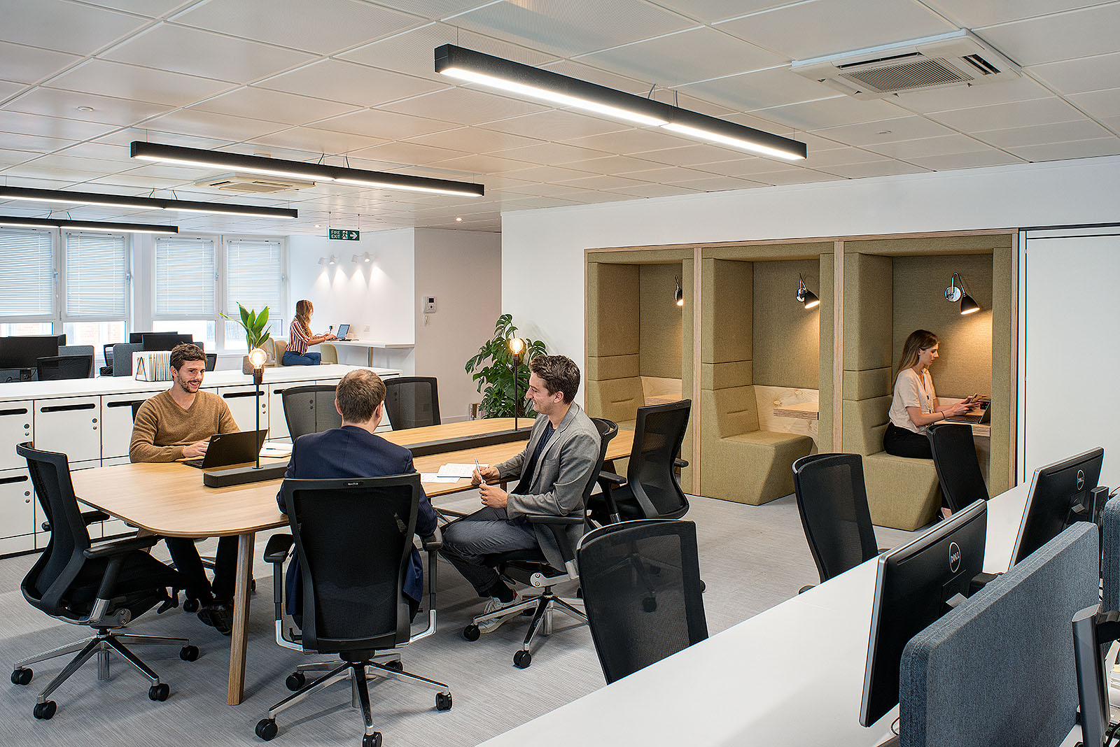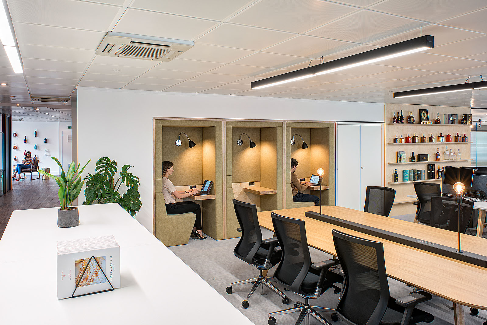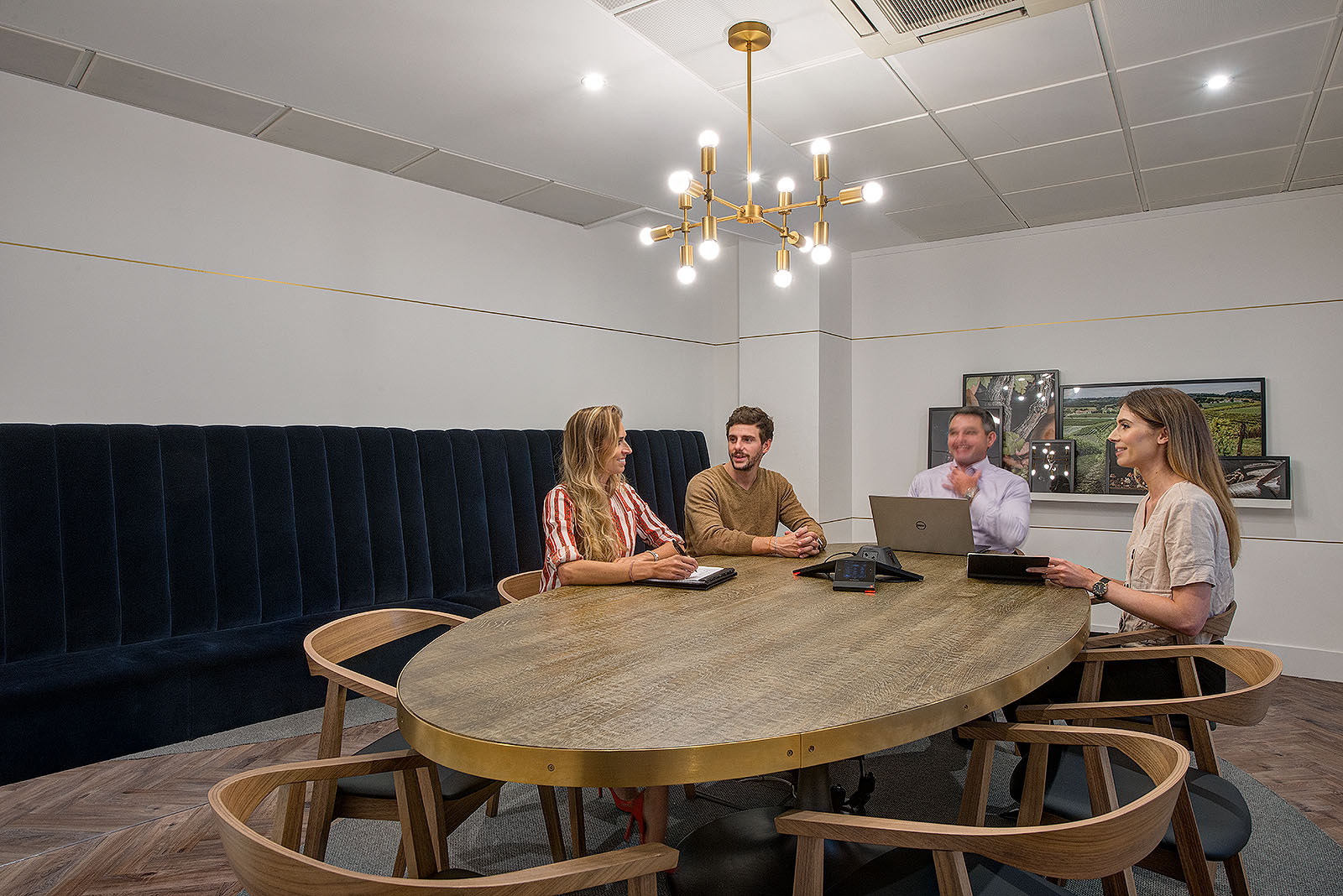 Understanding the story behind the brand was an important element in the design-brief, but above all our clients wanted a space that was sympathetic with the building, providing an environment where staff would feel comfortable and giving clients an impressive visitor experience. Our clients also needed to accommodate a 60% headcount growth in the new space. Removing the cellular offices and entrance corridor created a large, open space inviting natural light to flow and creating a more efficient planning matrix for the increased staff numbers. The design included two, strategically located, hot-desking lounges to encourage staff to move around throughout the day and choose the working environment most suited to the task in hand. The bar is celebrated as a key part of the client experience; located next to the meeting suite, clients can move seamlessly from the meeting rooms into the drinking area without needlessly disrupting the main work zones. An industrial-lux finishes palette was selected to balance the client’s request for an industrial aesthetic with the luxury heritage of the brand. Re-use of some of our clients soft furniture and architectural lighting adds an important sustainable element to the design, whilst fluted banquette seating, warm shades of timber flooring and a careful selection of on-brand paint colours brings warmth and comfort to the space.